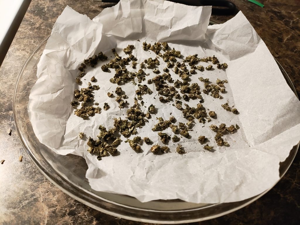 Preheat oven to 225° F. Line an oven safe dish with parchment paper. I used a pie pan. Break cannabis up by hand. You want popcorn kernel or sunflower seed sized pieces. It’s better to leave it coarse rather than grind the flower into a powder. Coarse pieces decarb more evenly and prevent the generation of plant dust that can pass through the cheese cloth and leave the oil gritty. Decarbing converts THCA (acidic, inactive cannabinoids) to THC (psychoactive cannabinoids). Leave cannabis in the oven for about 45 min. ABV does not need to be decarbed.
