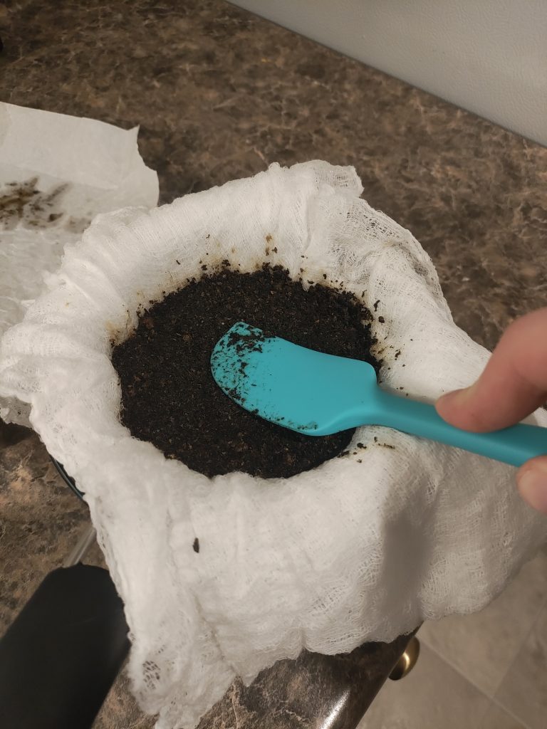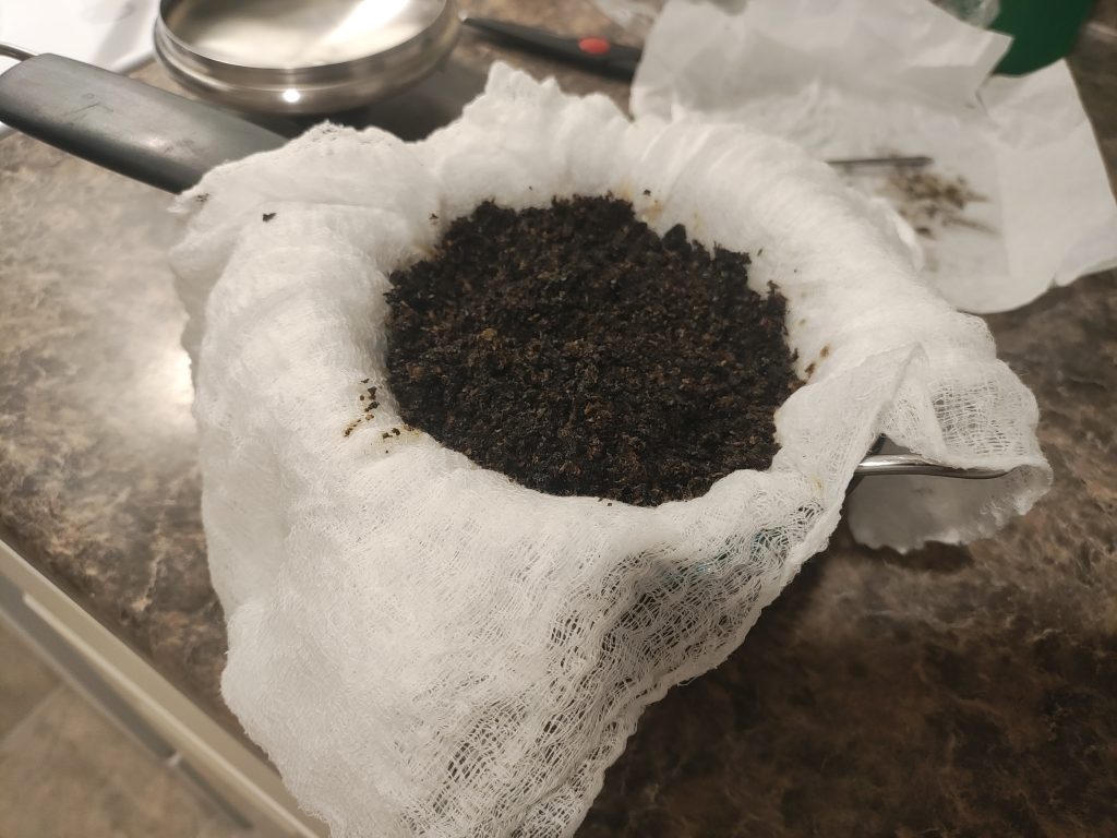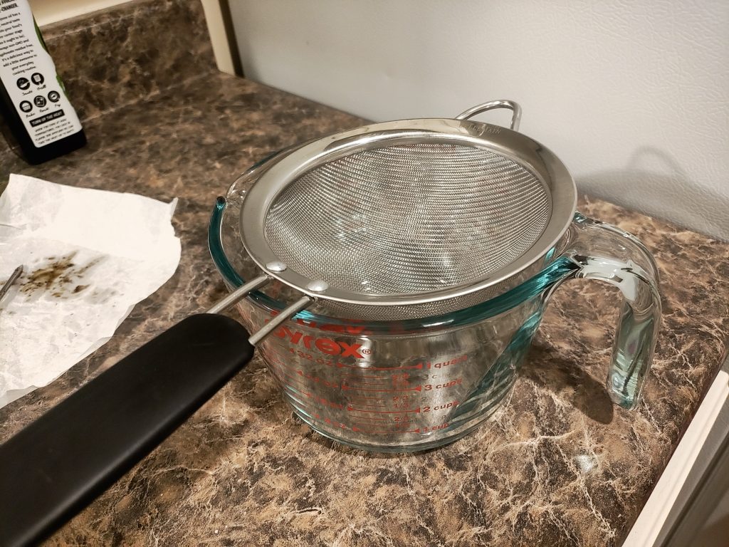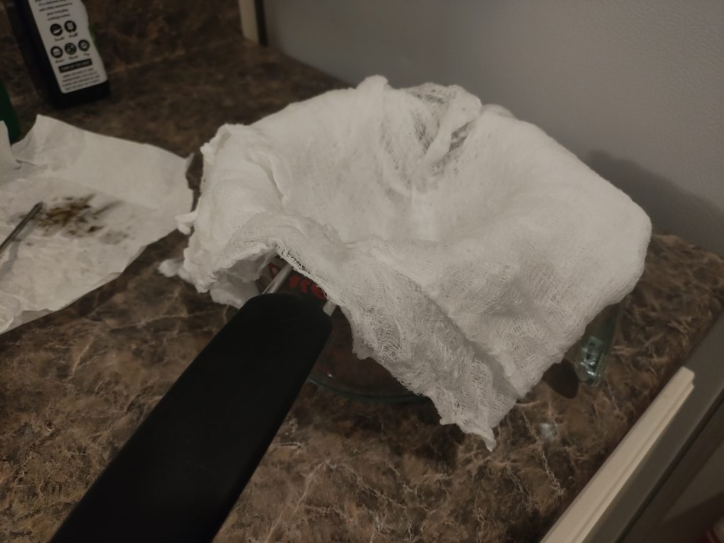 Place strainer in bowl of measuring cup. Arrange the cheese cloth over the strainer so that there are several layers covering the mesh and enough cloth hanging over the edges that it hangs down a bit. Don’t put more than three layers of cloth over the strainer because the cloth will absorb some oil that it won’t let for of. So the more cloth that comes in contact with the oil, the more oil will get lost. Having too few layers of cheese cloth will allow plant matter to get into the finished oil which will make it gritty and taste like hay.